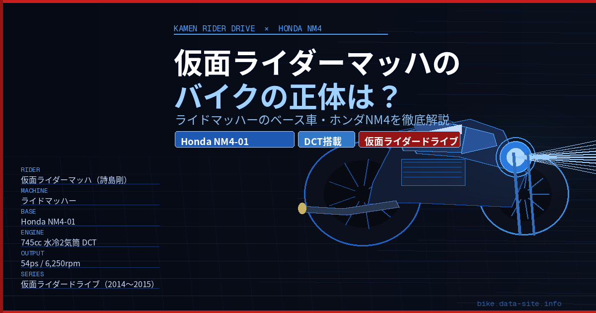 この記事では、ライドマッハーのベース車であるホンダNM4の詳細、NM4-01とNM4-02の違い、ライドチェイサーとの関係、そして現在の中古相場まで、バイクファン・仮面ライダーファン両方の視点からまとめてお伝えします。